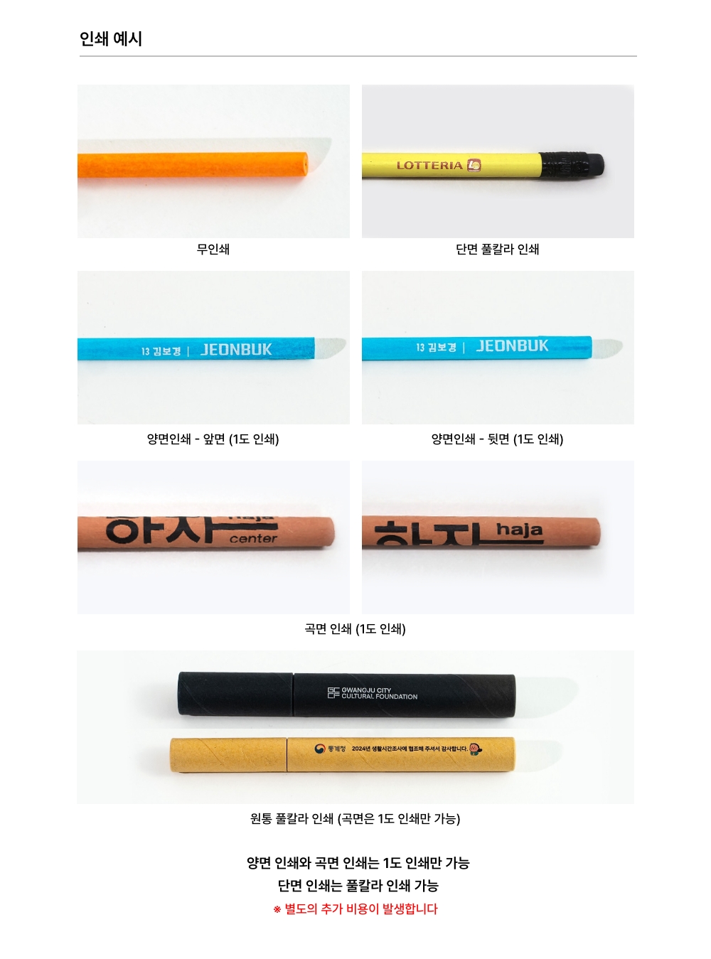 1.±âº»¼ö·®Àº ¿¬ÇÊ 1,000ÀÚ·ç ±âÁØÀÔ´Ï´Ù. (ÃÖ¼Ò¼ö·® ¹Ì¸¸ ½Ã Àμâºñ Ãß°¡ ÀÖ½À´Ï´Ù.) -¿¬ÇÊ 1,000ÀÚ·ç, 3º»ÀÔ 300¼¼Æ®, 5º»ÀÔ 200¼¼Æ®, 10º»ÀÔ 100¼¼Æ® µî 2.ÃÖ¼Ò¼ö·® ¹Ì¸¸ ½Ã Àμâ Ãß°¡ ºñ¿ë ¹ß»ýÇÕ´Ï´Ù. 3.Àμâ´Â 1µµ °î¸éÀμ⠶Ǵ uv ǮĮ¶ó Àμ⠰¡´ÉÇÕ´Ï´Ù. -¿øÇü ¿¬ÇÊ, ¿øÅëÀº 1µµ °î¸éÀμâ (¾Õ, µÚ µÎ ±ºµ¥ ¶Ç´Â °î¸éÀ¸·Î µ¹¾Æ°¡¸é¼ Àμ⠰¡´ÉÇÏ¸ç ¾ç¸éÀμâ Ãß°¡ ºñ¿ë ¾ø½À´Ï´Ù.) (*À°°¢, ¸ù´ç ¿¬ÇÊÀº ÇÑ ¸é¸¸ Àμ⠰¡´ÉÇÕ´Ï´Ù.) -¿¬ÇÊ, ¿øÅë uv ǮĮ¶ó Àμâ´Â ´Ü¸é ÀμâÀÔ´Ï´Ù. 4. ¿¬ÇÊ Àμâºñ´Â ¹«·áÀ̳ª, ¿øÅë Àμ⠽à (1µµ °î¸é ½ÇÅ©Àμ⠶Ǵ ǮĮ¶ó ´Ü¸éÀμâ) Ãß°¡ºñ¿ë ¹ß»ýÇÕ´Ï´Ù. 5. ¿øÅë »ö»ó º¯°æ °¡´É ÇÕ´Ï´Ù. 6. ¹è¼Ûºñ ¹× ÀÔ¼ö ·® ¾È³» -¿¬ÇÊ 1¹Ú½º¿¡ 2000ÀÚ·ç- 3000¿ø º°µµ -¿øÅë 1¹Ú½º¿¡ 3º»ÀÔ 600¼¼Æ®, 5º»ÀÔ 500¼¼Æ®, 10º»ÀÔ 250¼¼Æ®: 4500¿ø º°µµ